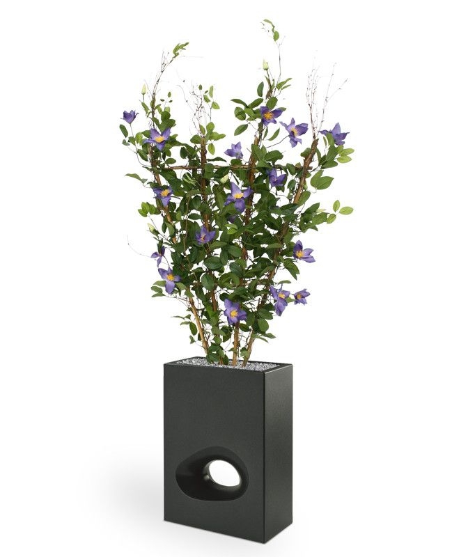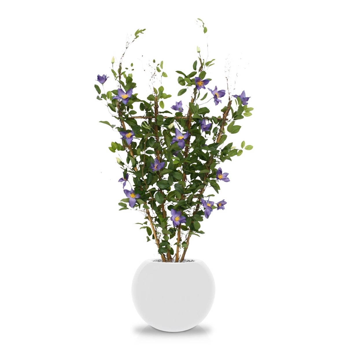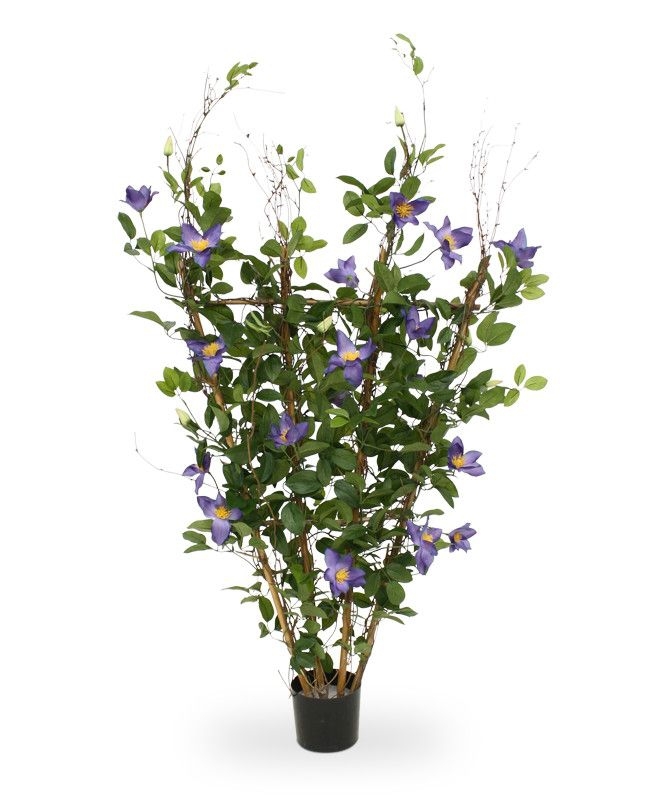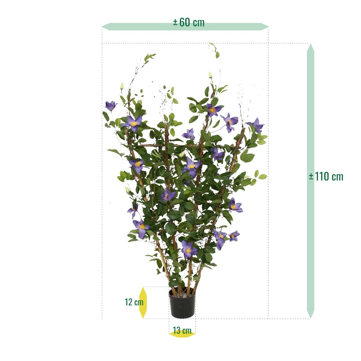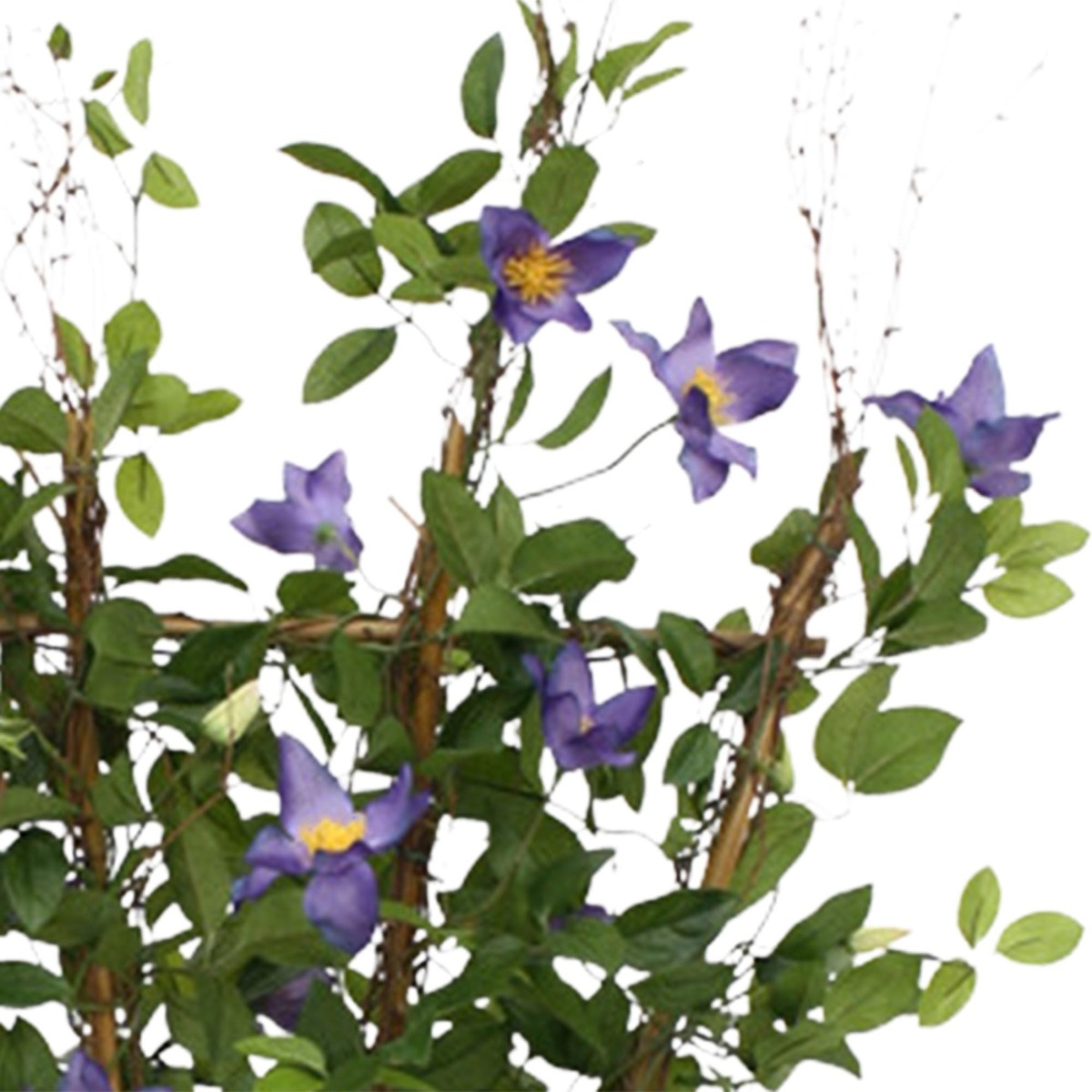 Una novità nella nostra gamma di piante artificiali fiorite è questa siepe di Clematis di alta qualità. Il rampicante è realizzato attorno a un'intelaiatura di bambù che dà forma alla clematide. Le foglie di seta dall'aspetto fresco e i vivaci fiori viola rend