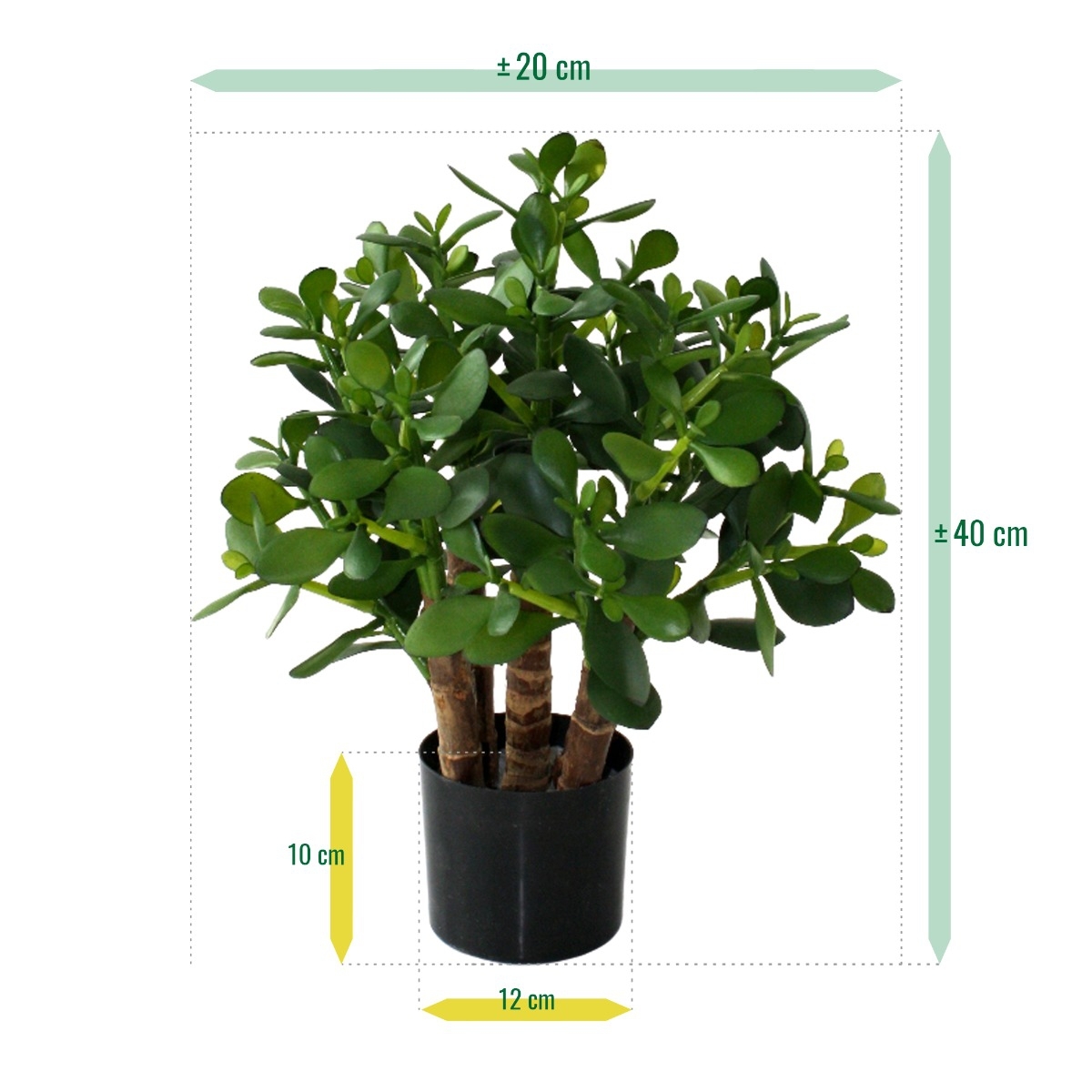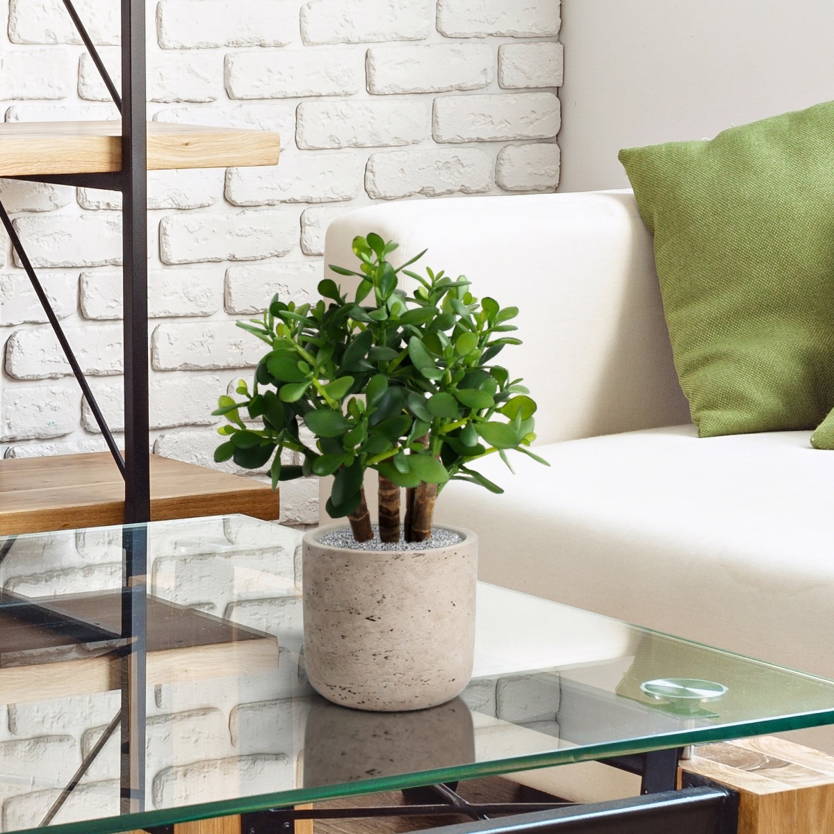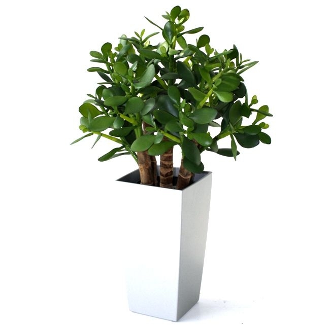 La pianta artificiale Crassula, con le sue foglie spesse e gli steli di legno vero, è una bella succulenta per la tavola o il davanzale. Come pianta singola in un vaso alto, o con diverse piante in fila, con questa pianta artificiale simile a un cactus si può