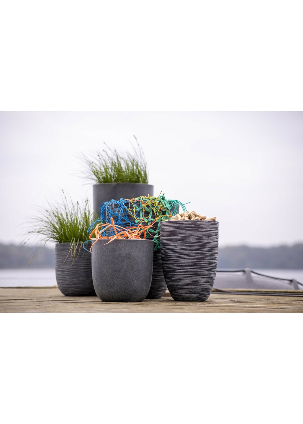This sustainable flower pot from the Capi Waste Rib NL collection is CO2 neutral produced in the Netherlands and is made from waste; fishing nets, recycled cork & recycled Capi pots. This collection takes responsibility for one of the biggest waste problems these days; fishing nets. These fishing nets are combined with old corks and recycled Capi pots to create high-quality designer flower pots. The pot is suitable for indoor and outdoor use and comes with a lifetime guarantee. This pot has the Recyclass certificate for 98.6% recycled content. The Rib texture gives this pot a natural look. This texture is inspired by braided reeds and their thin lines. The narrow, dancing lines add a playful touch to these pots in addition to a natural look. Together, let's take care of our oceans, ourselves and the new generations. Will you join us?
